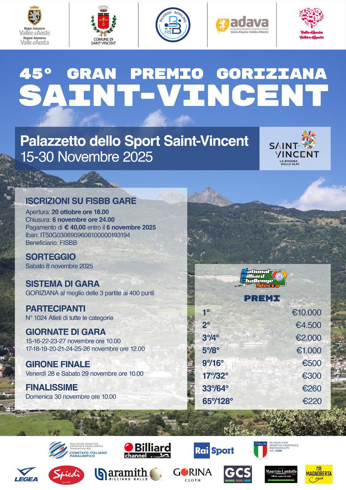 Il Gran Premio Goriziana di Saint-Vincent rappresenta uno degli appuntamenti più importanti e longevi nel calendario del biliardo sportivo italiano, dedicato alla specialità della goriziana, una variante tecnica e molto apprezzata del gioco del biliardo a 5 birilli. Giunto alla sua 45° edizione, l’evento ha saputo consolidarsi nel tempo come una prestigiosa vetrina per i migliori giocatori nazionali e internazionali, attirando sempre più professionisti e addetti ai lavori.